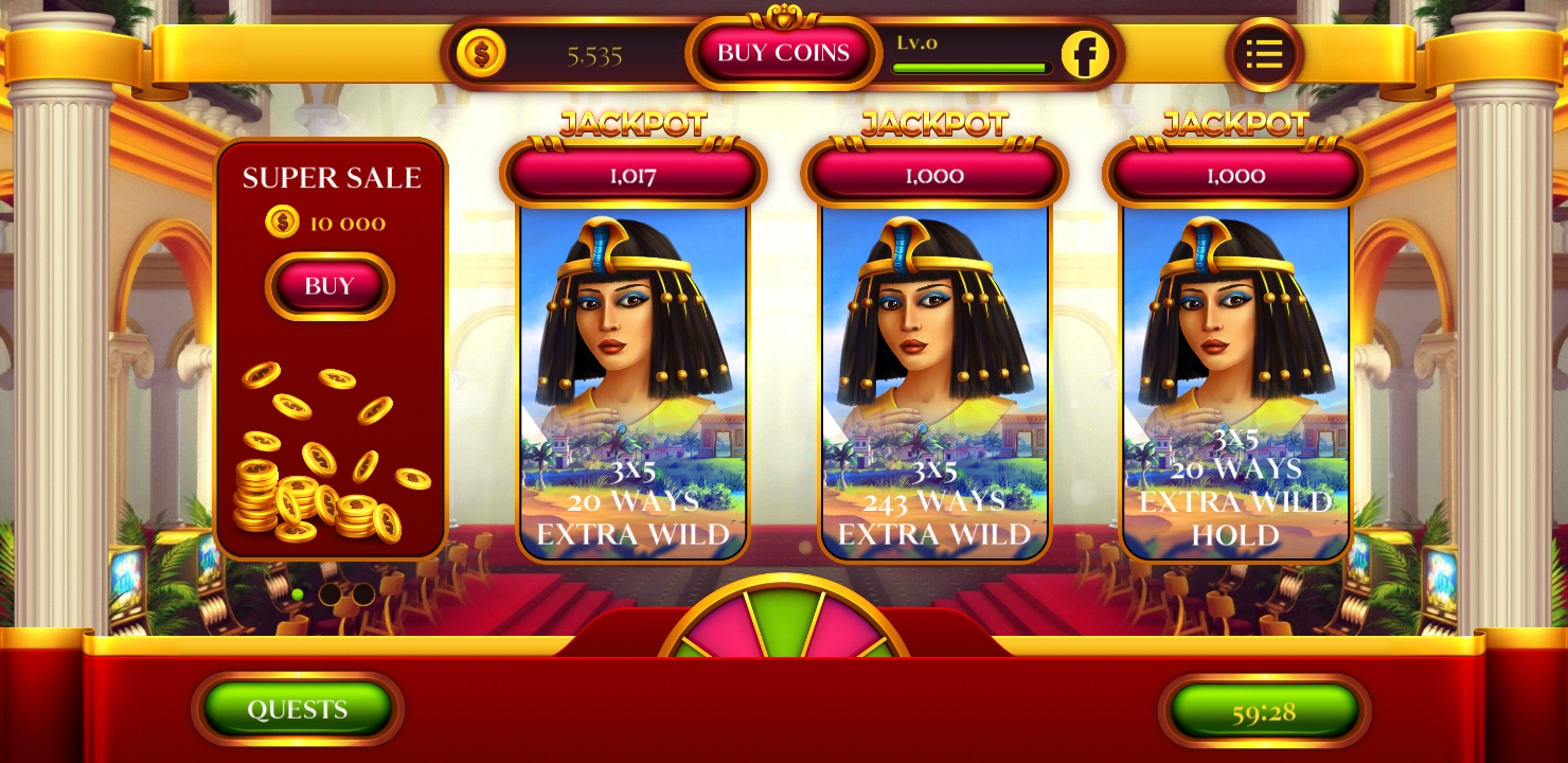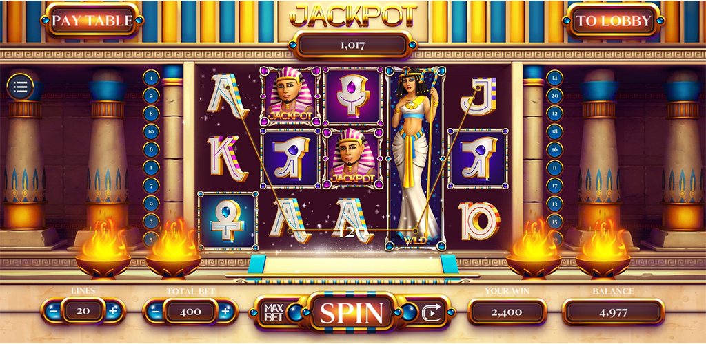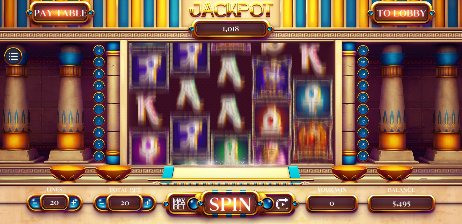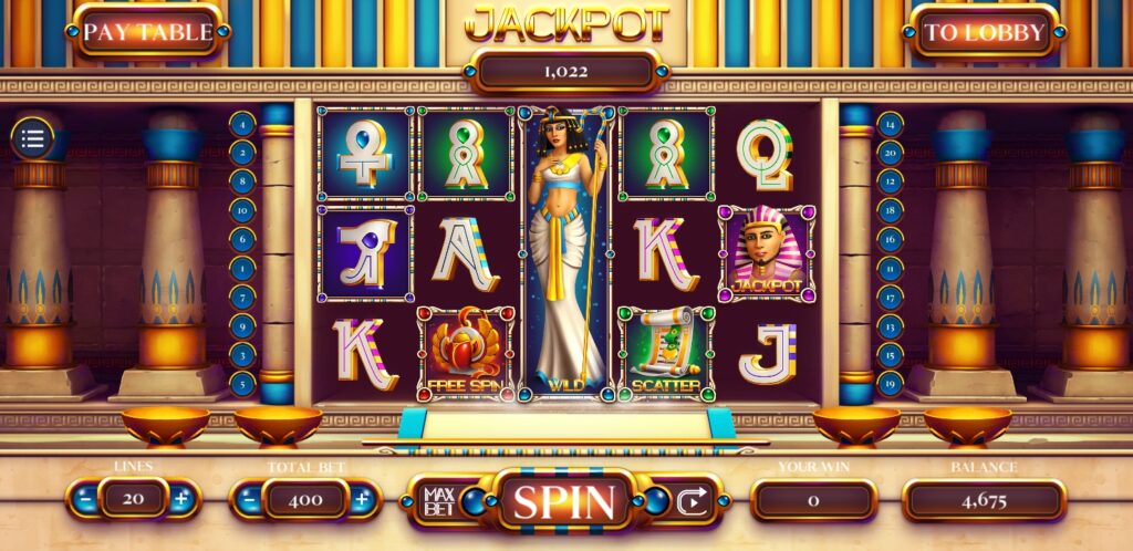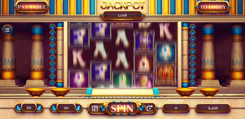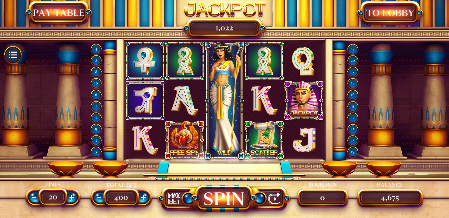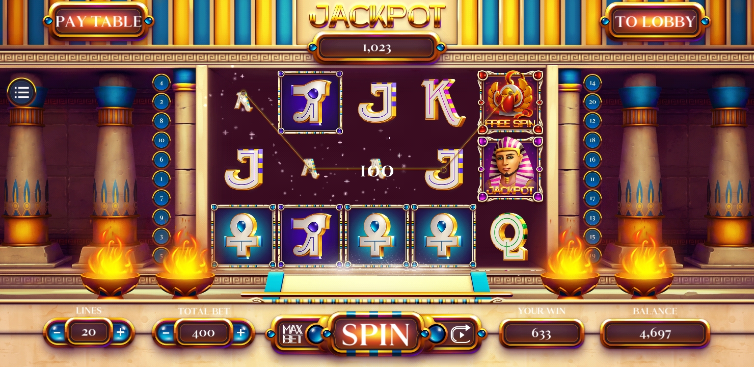 Paytable, lobby, and 3 different slots of Egyptian pharaoh style, full animations