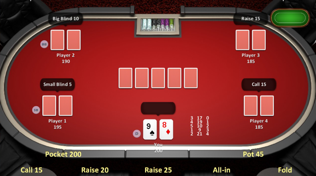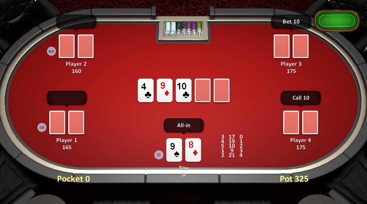 ALL regular Texas Hold Em’ Rules and full spectrum of hands possible
